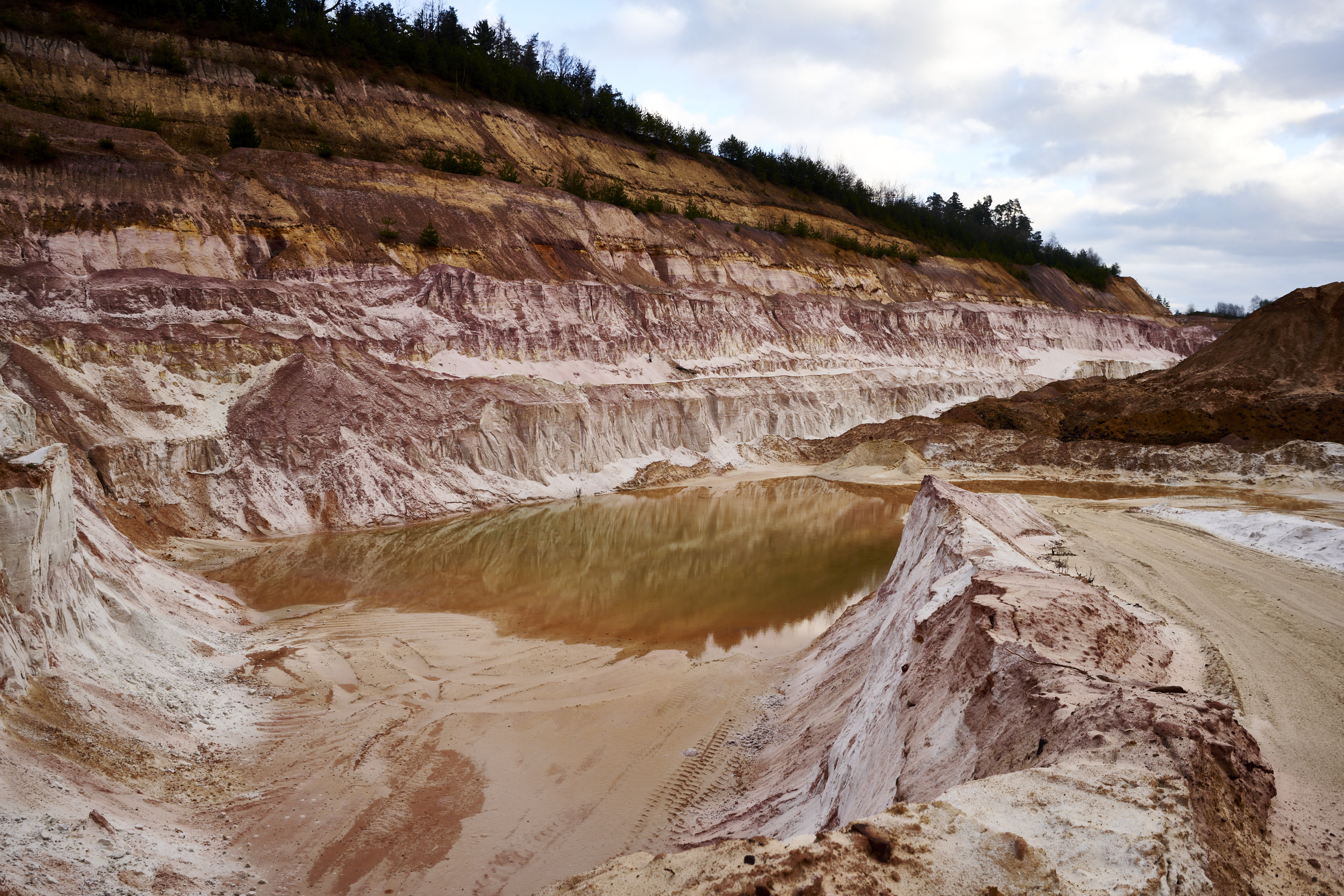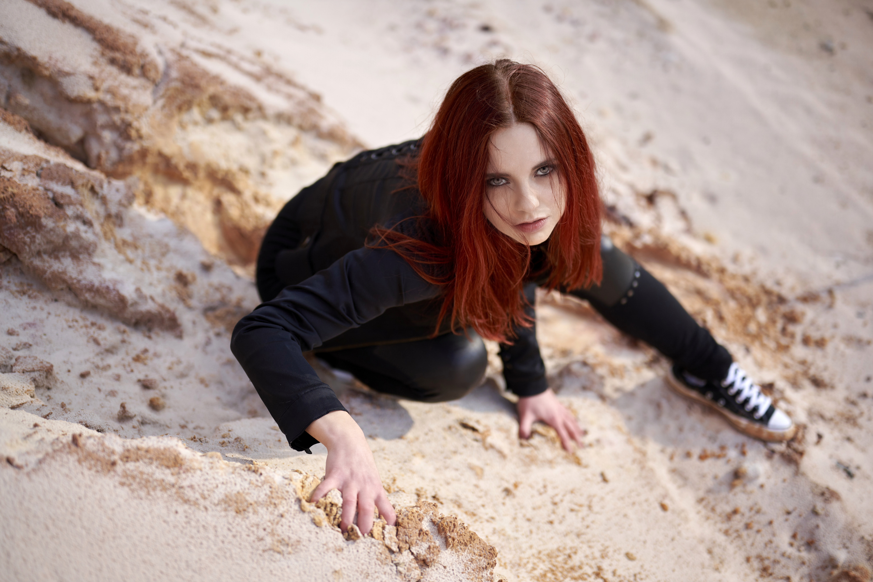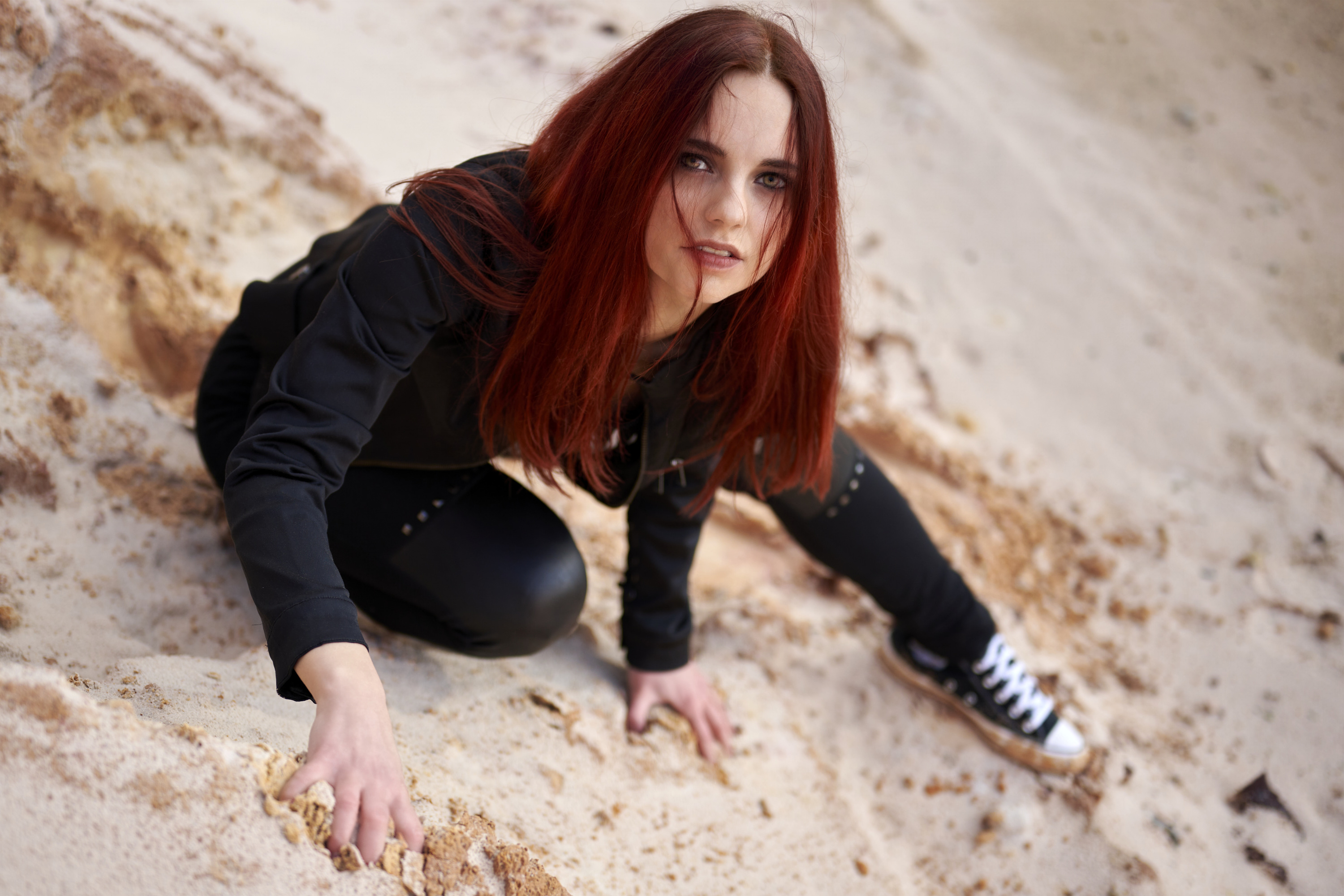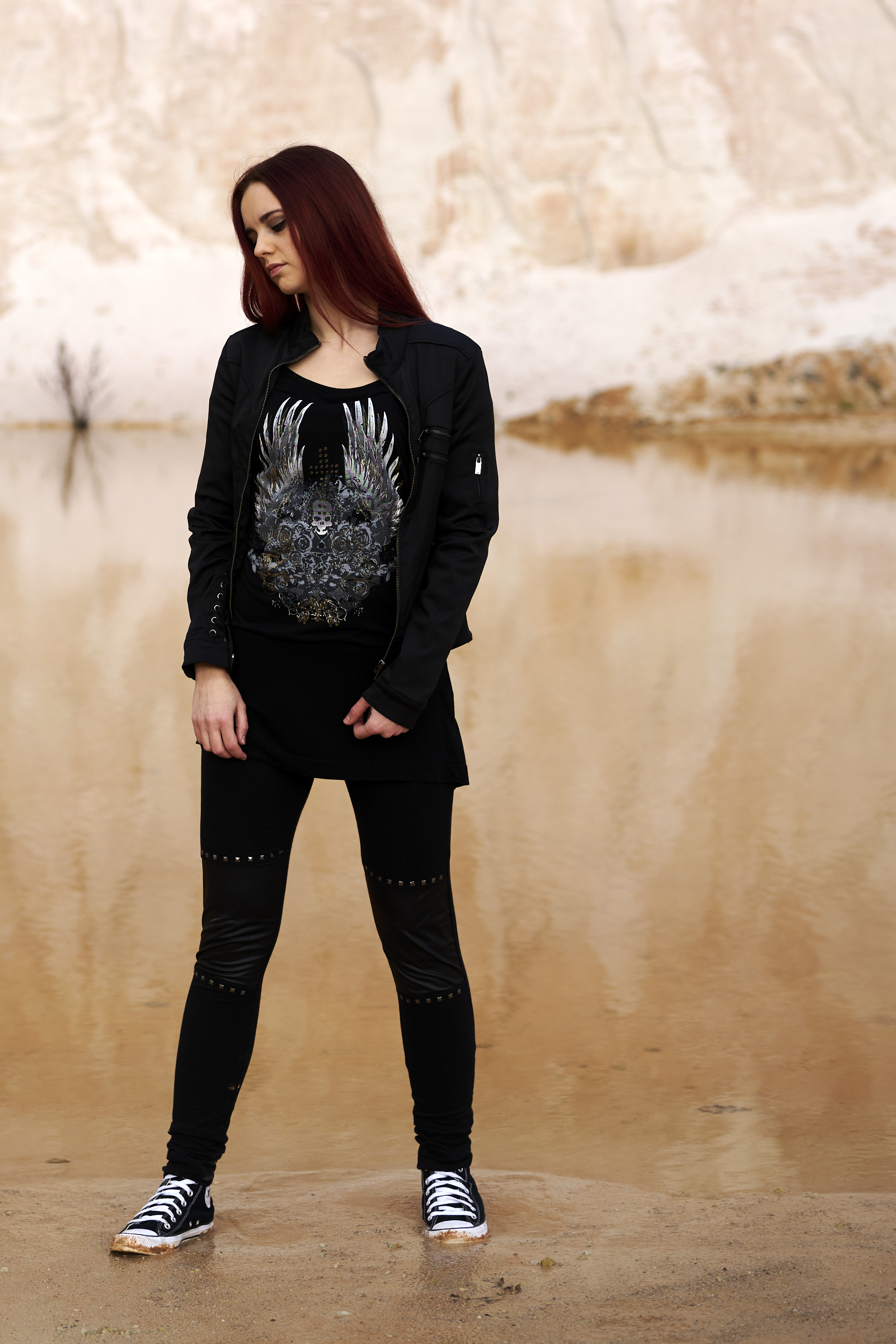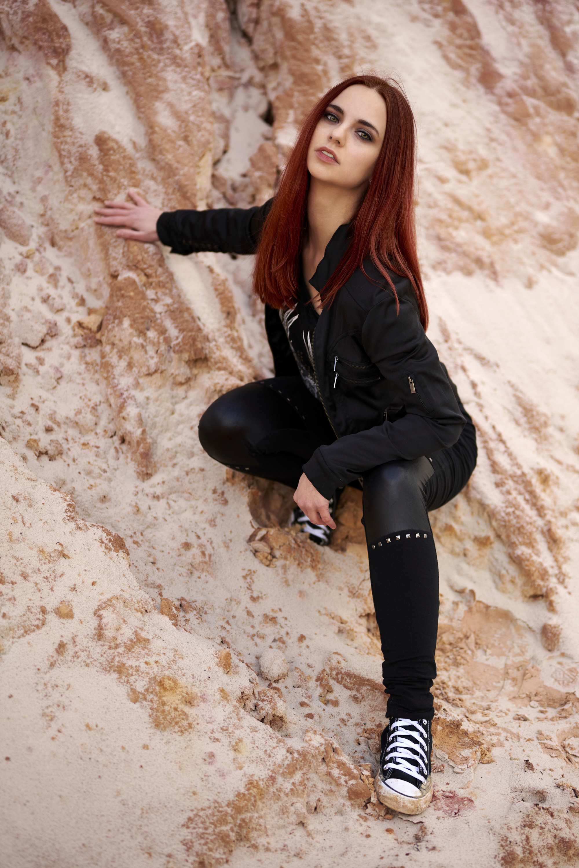 Eigentlich wollte ich nur eine große Sandgrube für ein Shooting erkunden und ein paar Testbilder knipsen. Kurz vorher überlegte ich, dass ein Fotomotiv hilfreich wäre und so schrieb ich kurzerhand Corinna an, die auch gleich zugesagt hat. Die Grube selbst ist echt interessant: Rote Felsen, weißer Sand, gelbes Gestein – das alles wirkt wie eine Mondlandschaft.